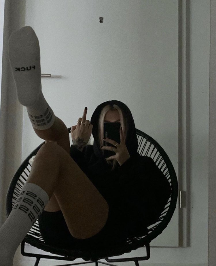 Blonde shows the middle finger without a face