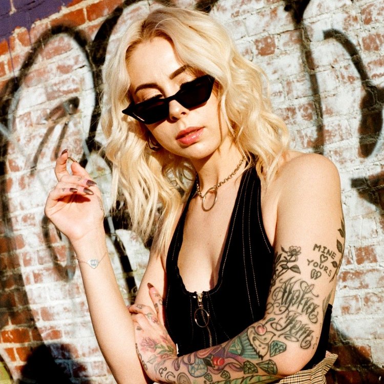 Blonde in a car with a tattoo